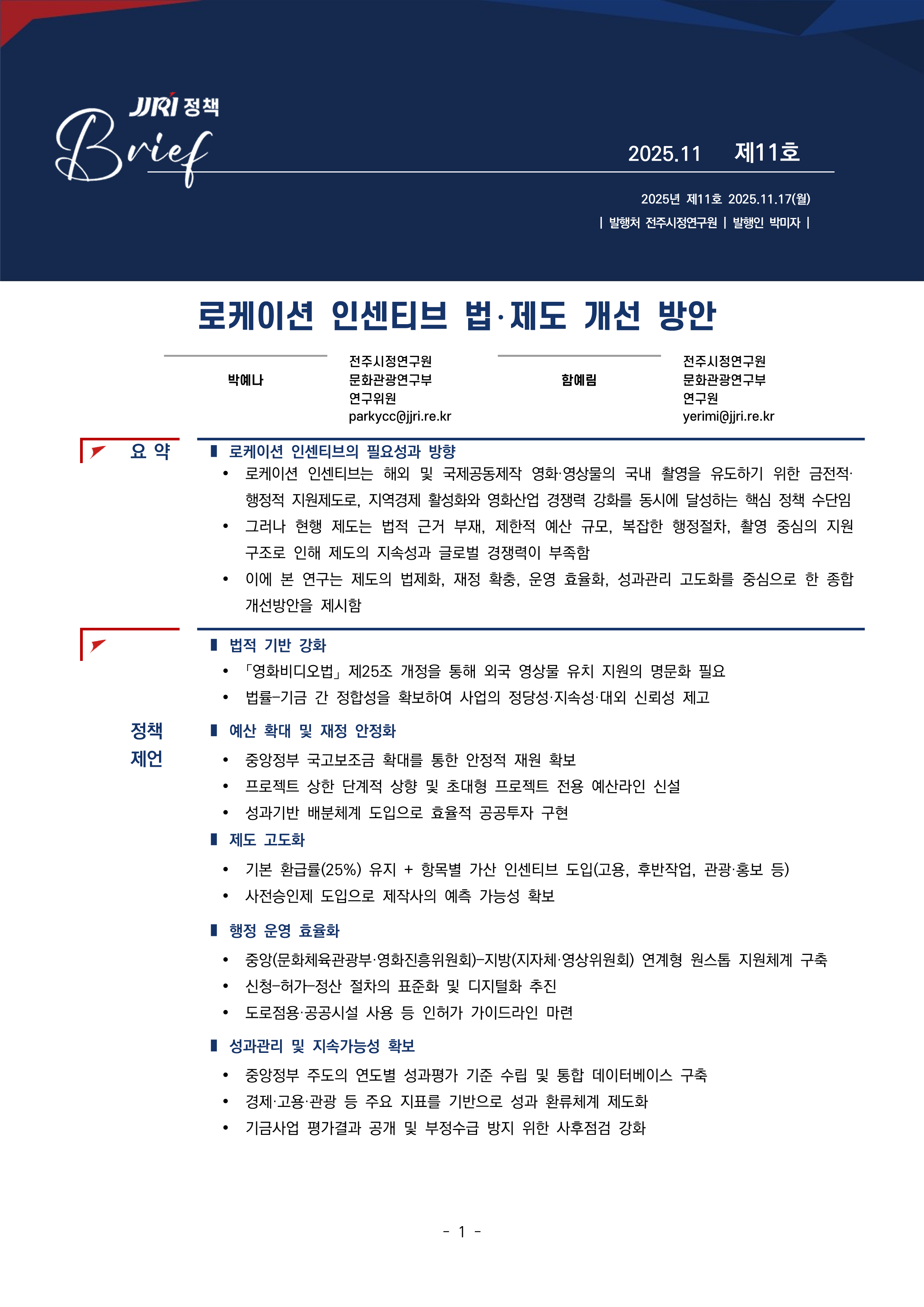 정책브리프 제11호: 로케이션 인센티브 법제도 개선 방안